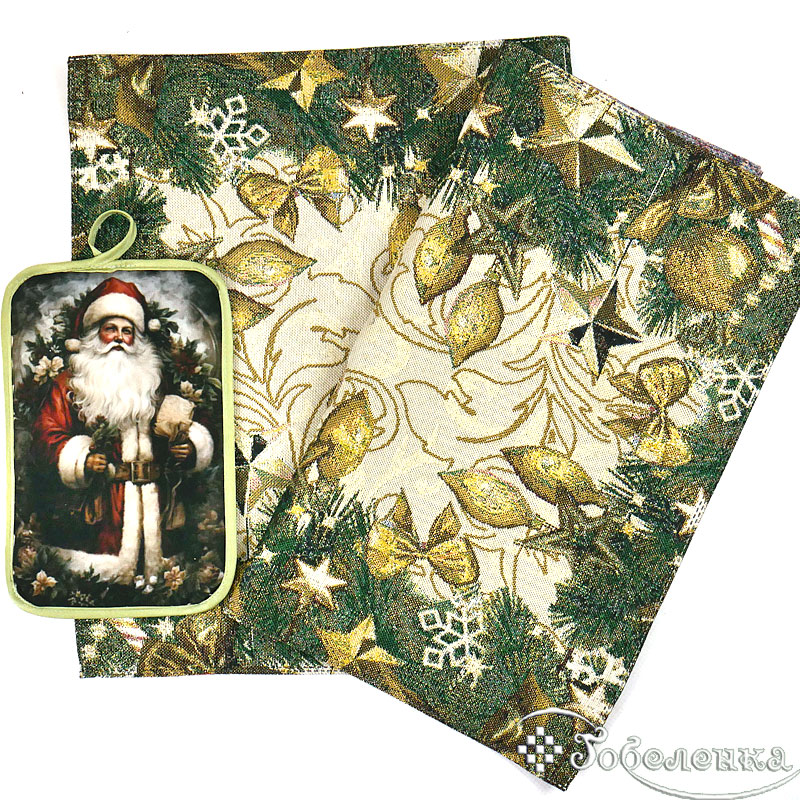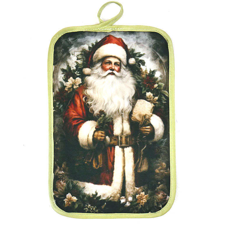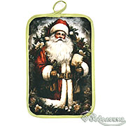 Каждое переливание золотистых нитей под светом свечей – это приглашение к чуду и радости. А вот и еще один новогодний сувенир: прихватка с символичным изображением Деда Мороза. Она не только красива, но и несет в себе заботу о тепле и домашнем уюте.