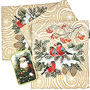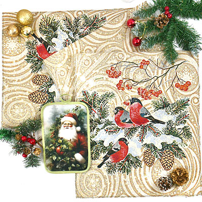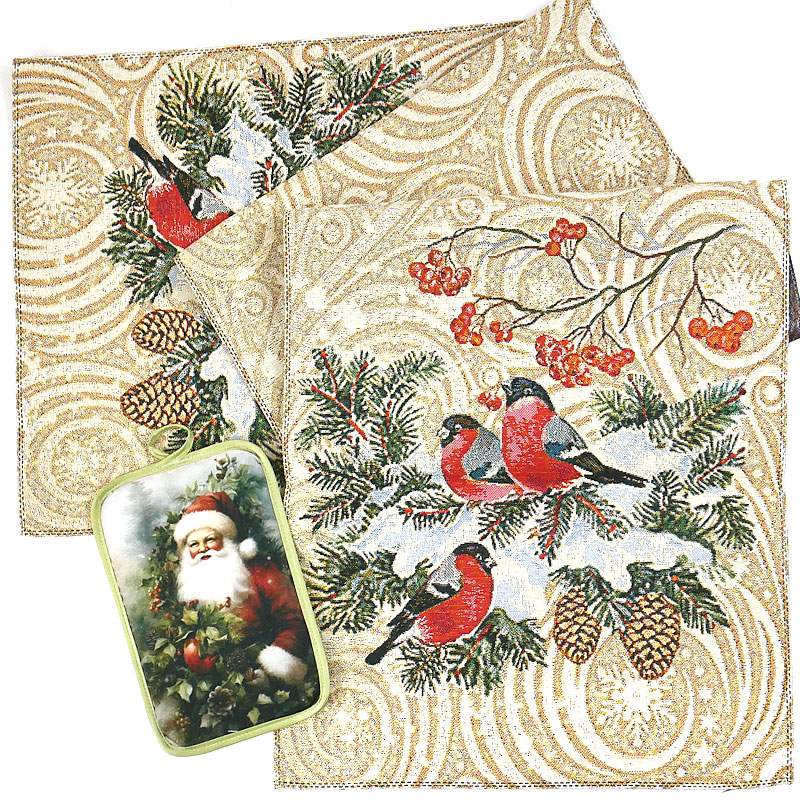 Наш набор Снегири-2 включает в себя элегантную дорожку из качественного гобелена размером 143х38 см, украшенную обаятельными снегирями, а также функциональную прихватку 22х15 см с изображением веселого Деда Мороза.