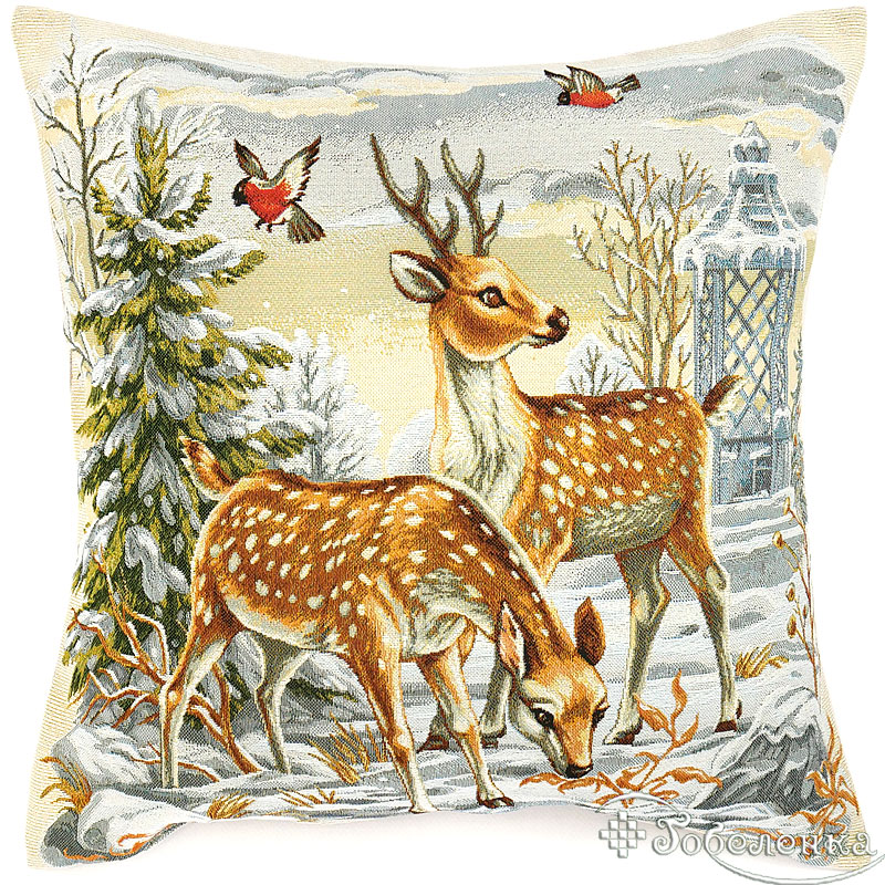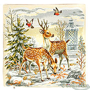 Зимний сюжет: на фоне елочки пара оленей и снегири.