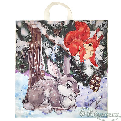 Пакет с петлевой ручкой и новогодним рисунком зимний лес с белочкой и зайчиком.