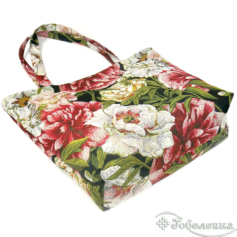 Эта сумка выполнена из гобелена с крупными цветами – пионами. Пионы представлены яркими оттенками: нежно-розовым, насыщенным малиново-красным и кремово-белым. Цветы располагаются на тёмно-лесной зелени, создавая потрясающий контраст, который подчёркивает каждую деталь лепестков и листьев.