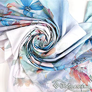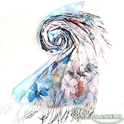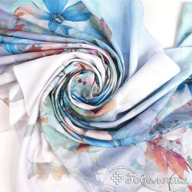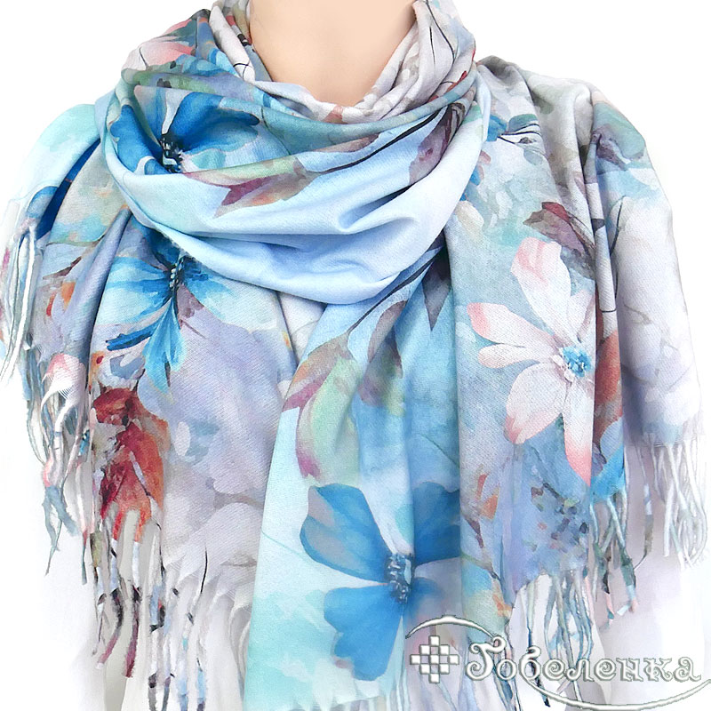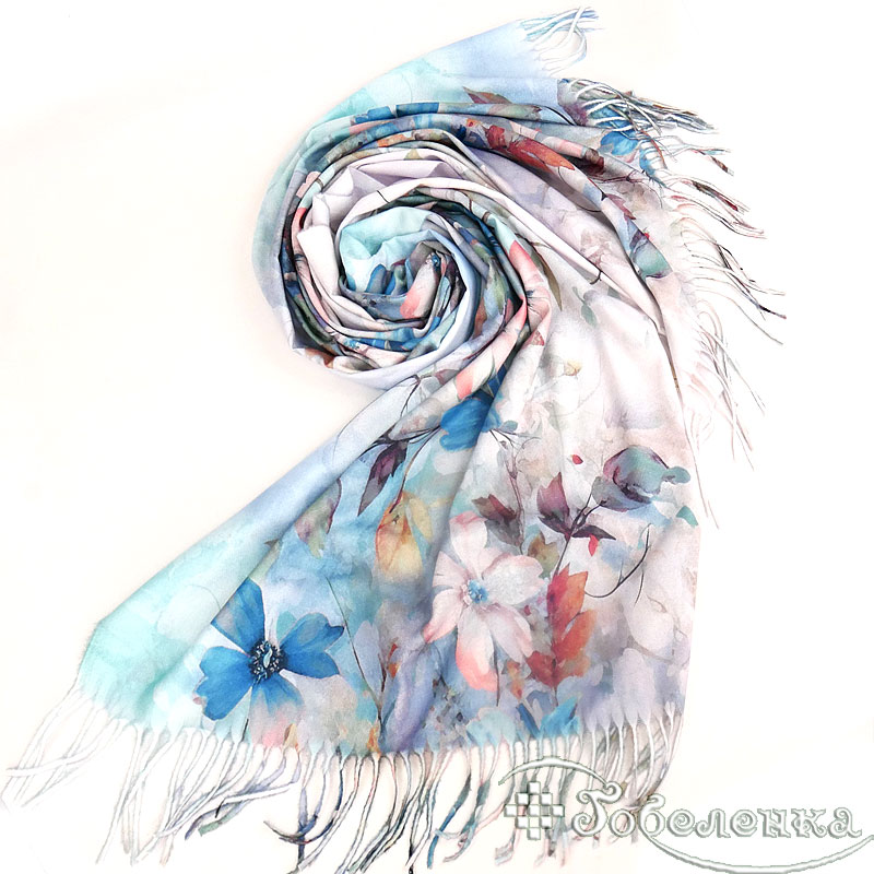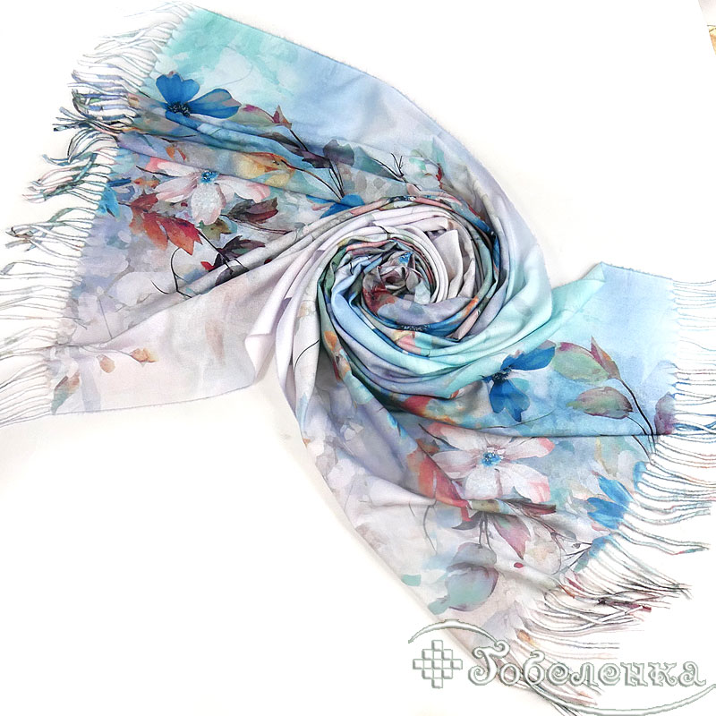 Теплый женский палантин бирюзового цвета с цветами из кашемина напоминает утреннее небо над озером, где распускаются цветы в акварельном стиле: крупные белые, голубые и розовые бутоны, мягкие веточки, листья с пастельными оттенками. Каждый цветок — как капля света, проникающая сквозь туман. Принт выполнен с тонкими переходами и воздушной текстурой — создаёт ощущение, что вы окружены живой природой.