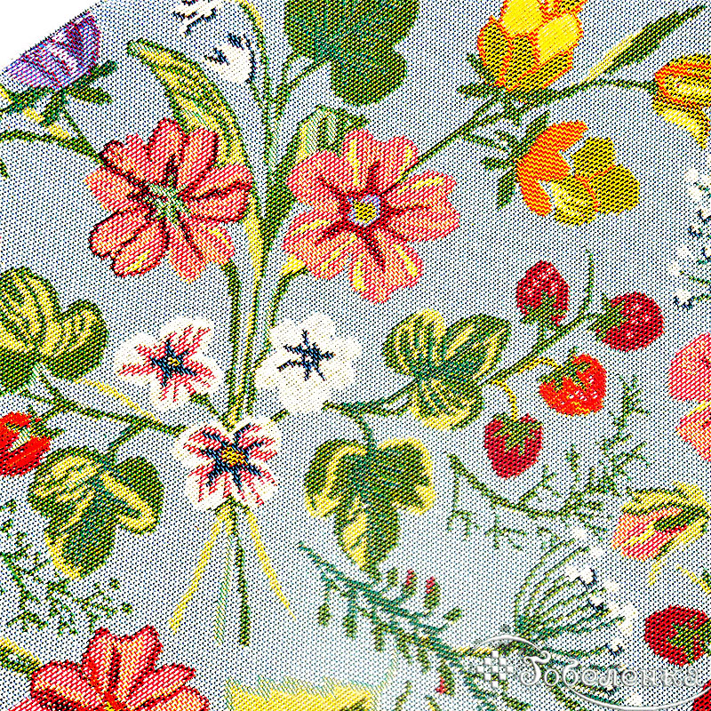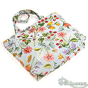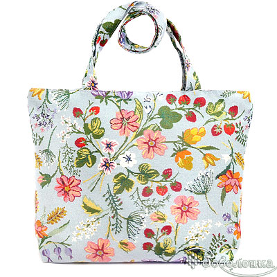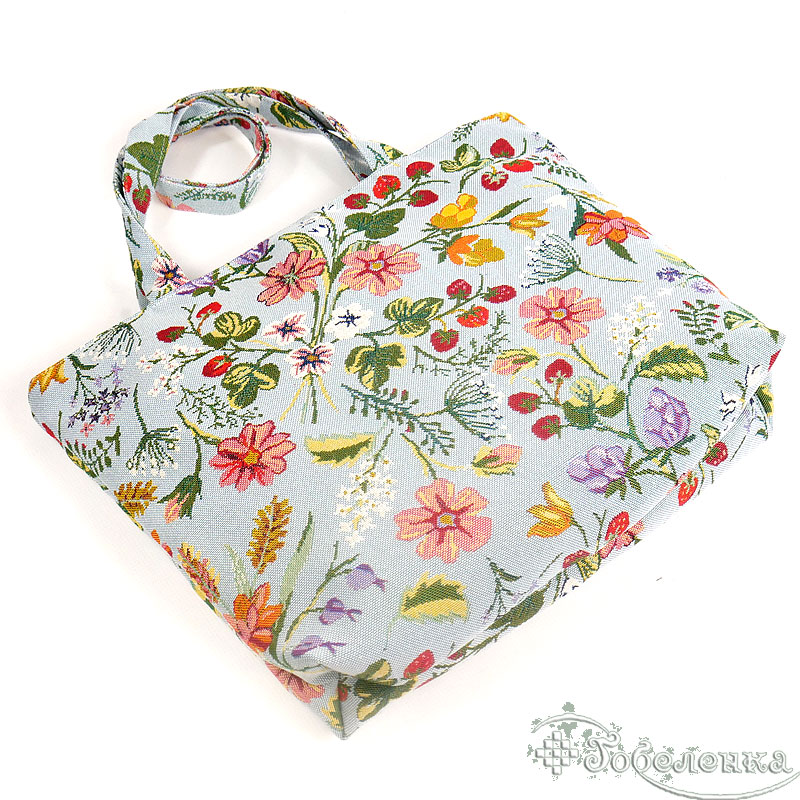 Представьте, как каждый день начинается с лёгкого аромата весны. Эта сумка - настоящий букет в ткани: на фоне нежно-голубого гобелена расцветают яркие цветы - розовые пионы, желтые одуванчики, красные ягоды, зелёные листья и деликатные травы. Это не просто узор - это живая природа, запечатлённая в тонкой вышивке.