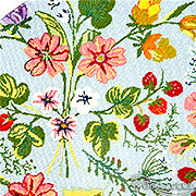Каждый элемент - от маленькой бабочки до крошечного плюща - выполнен с любовью и вниманием к деталям. Цветовая гамма - свежая, гармоничная, напоминающая утренний сад после дождя: светло-голубой фон, акценты в розовом, жёлтом, зелёном и красном - создаёт ощущение лёгкости, радости и внутреннего покоя.