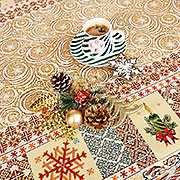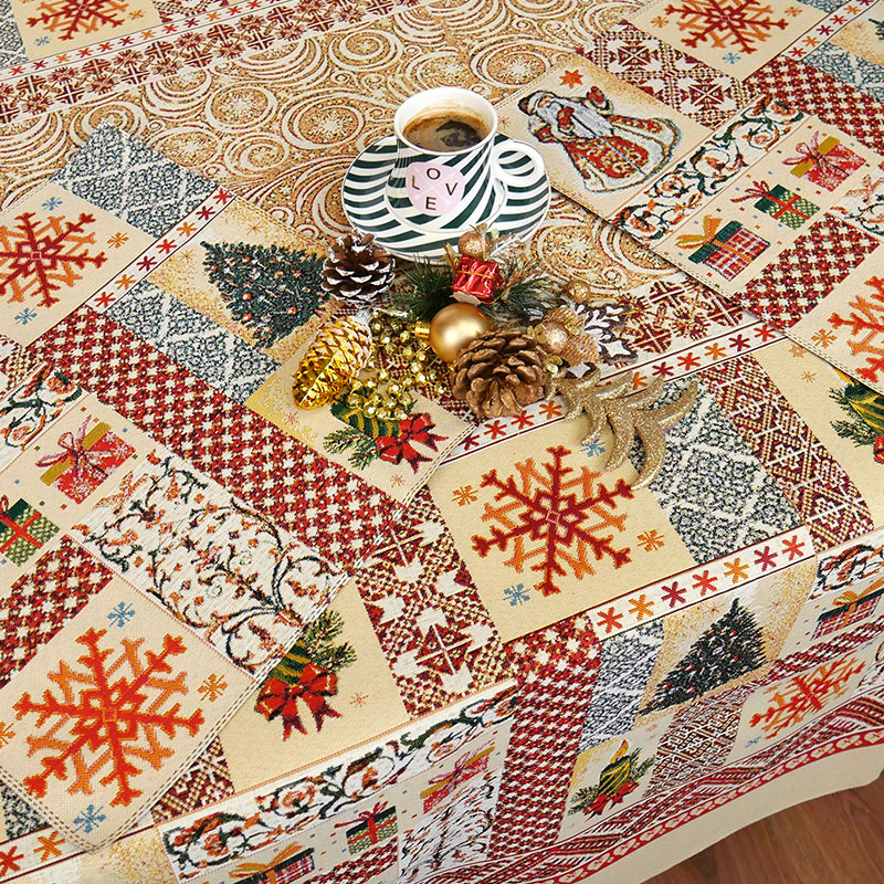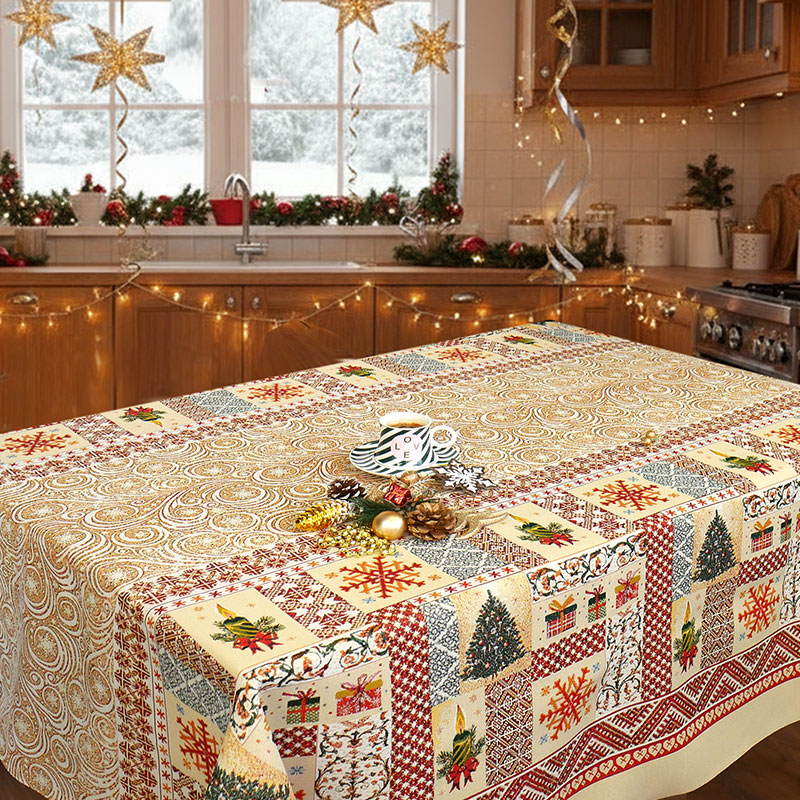 Представьте: вы заходите в кухню - и сразу чувствуете волшебство. На столе - скатерть Новогодний орнамент, будто сошедшая с рождественской открытки. Каждый квадрат — как маленький мир: ёлочки, снежинки, подарки, свечи, звёзды, олени, домики в снегу… Всё это сплетено в единую мозаику, где каждый элемент - как нота в симфонии праздника.