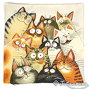 На подушке Мурчащая компания - десятки котиков, каждый со своим характером, взглядом и улыбкой. Один - с ленивой улыбкой, будто только что проснулся. Другой - с удивлёнными глазами, как будто только что увидел мышку. Третий - с язычком, будто только что съел что-то вкусное.