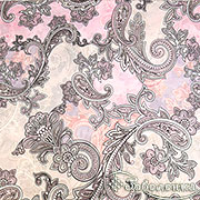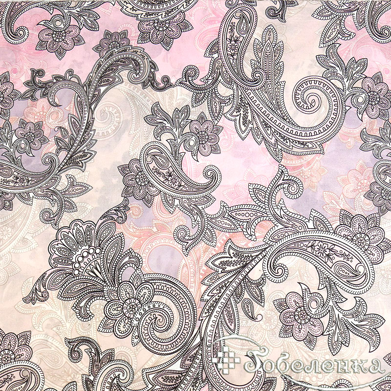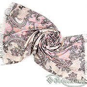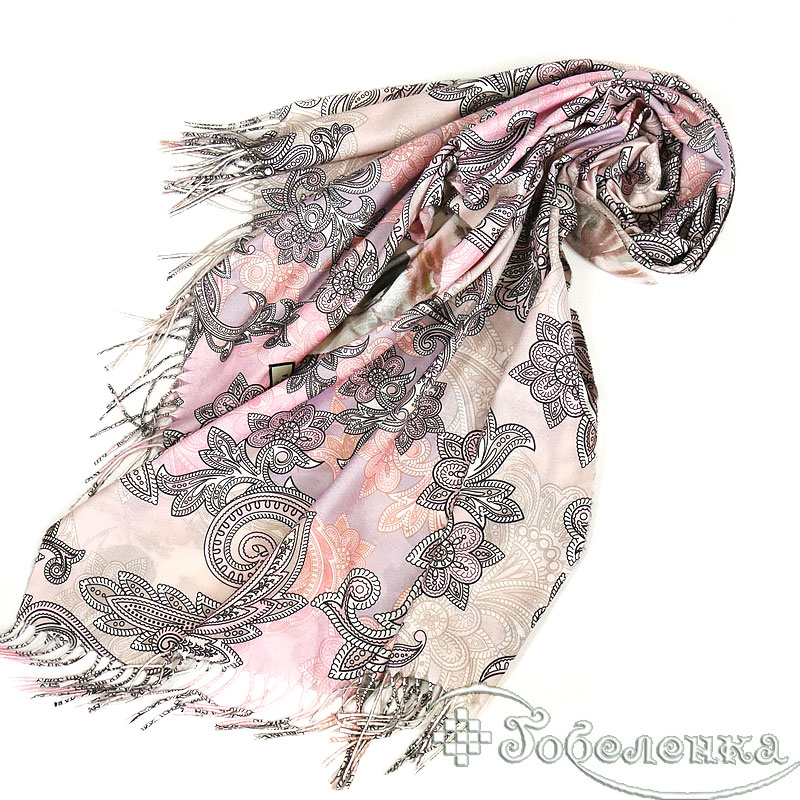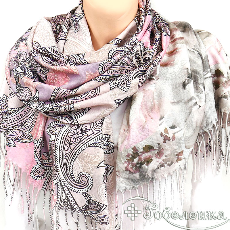 С одной стороны палантина изображён детализированный восточный узор "пейсли" – завитки и сложные цветочные мотивы выполнены тонкой линией черного цвета на фоне дымчато-розовых и светло-бежевых оттенков. В палитре преобладают светло-сиреневый, нежно-розовый, пастельный беж, а детали изящно выделены контрастным графичным рисунком. Такой орнамент придаёт аксессуару изысканность и актуальность, подчёркивая индивидуальность стиля.