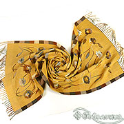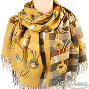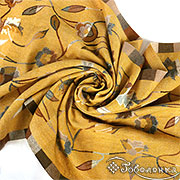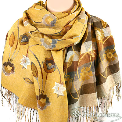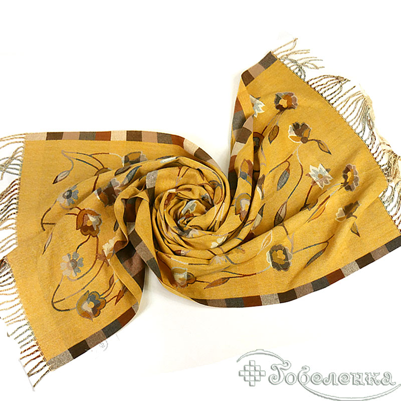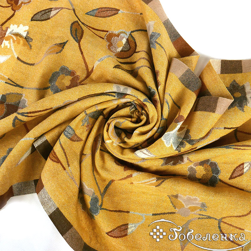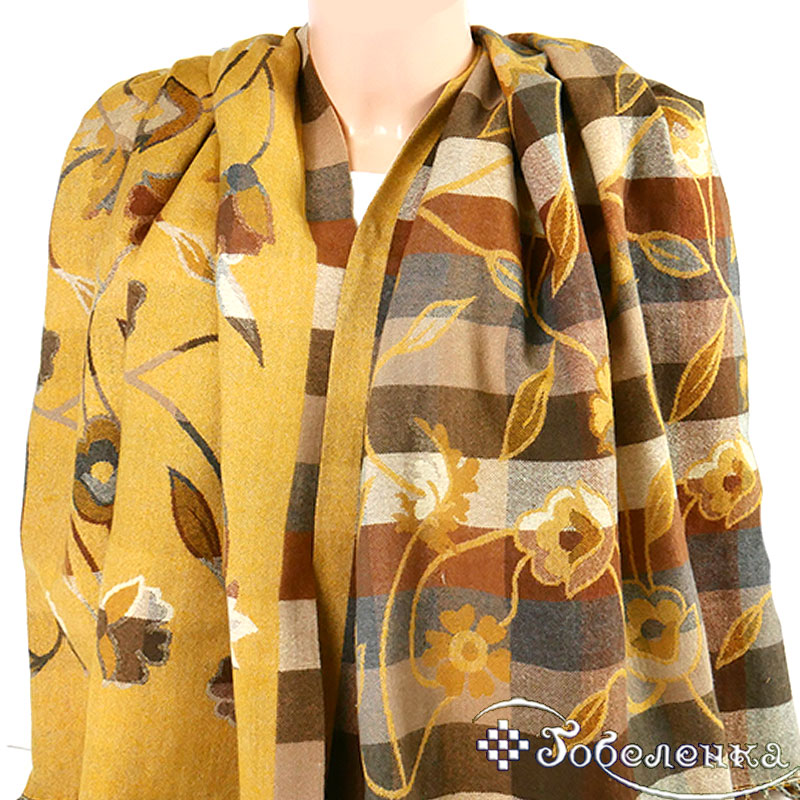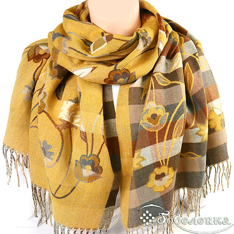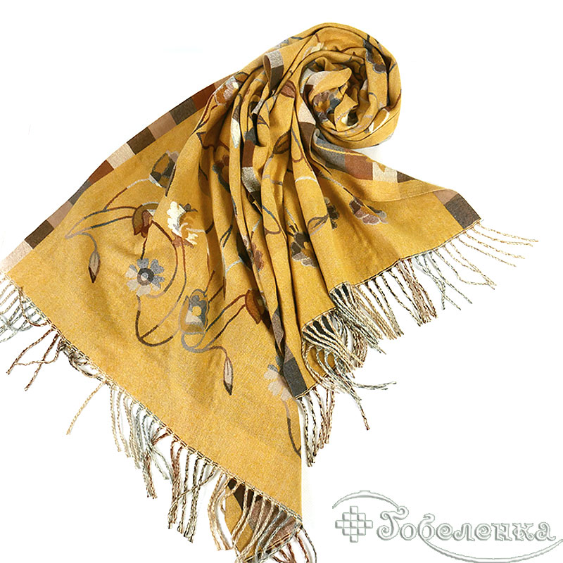 Палантин выполнен в приглушённой серой и горчичной гамме, наполнен нежными оттенками коричневого и серого. Грациозный узор из цветочных мотивов и гармоничных клеток создаёт эффект винтажной акварели - мягкие линии, плавные переходы, уютная палитра. Жемчужно-серые, морозно-коричневые и лёгкие молочные переливы идеально дополнят базовый гардероб, выглядят стильно и небанально.