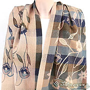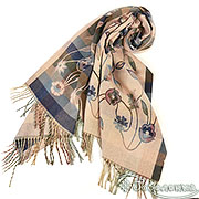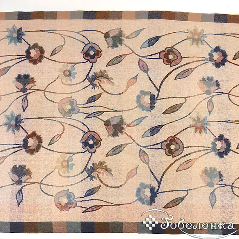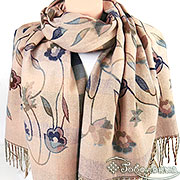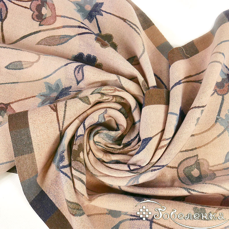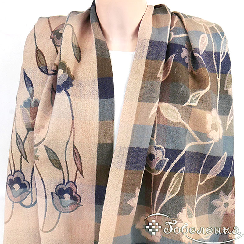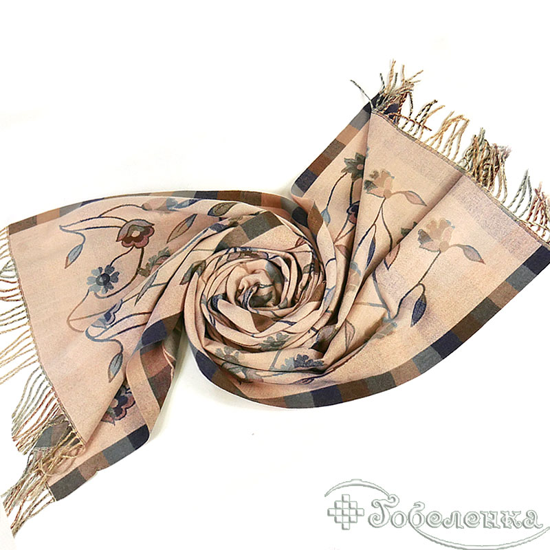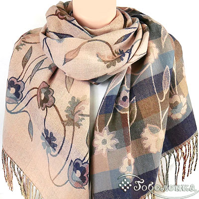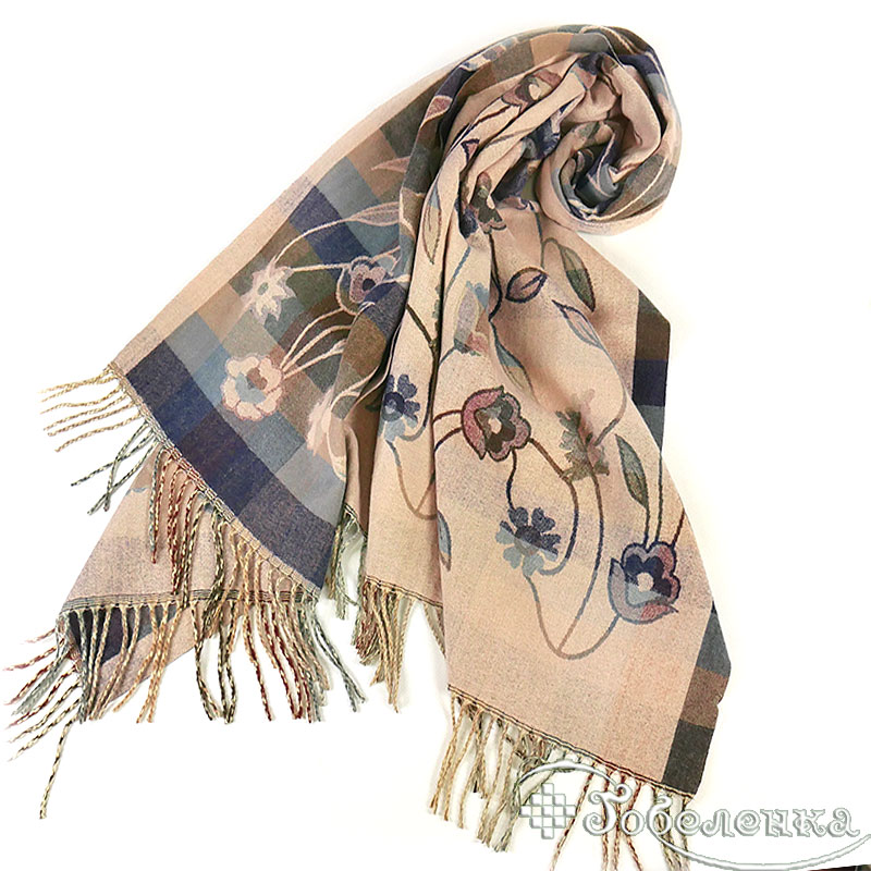 Палантин выполнен в пудровой гамме, наполнен цветами. Грациозный узор из цветочных мотивов и гармоничных клеток создаёт эффект винтажной акварели - мягкие линии, плавные переходы, уютная палитра.