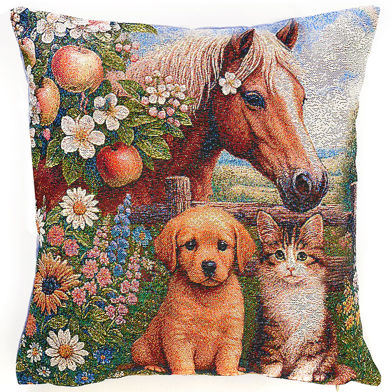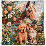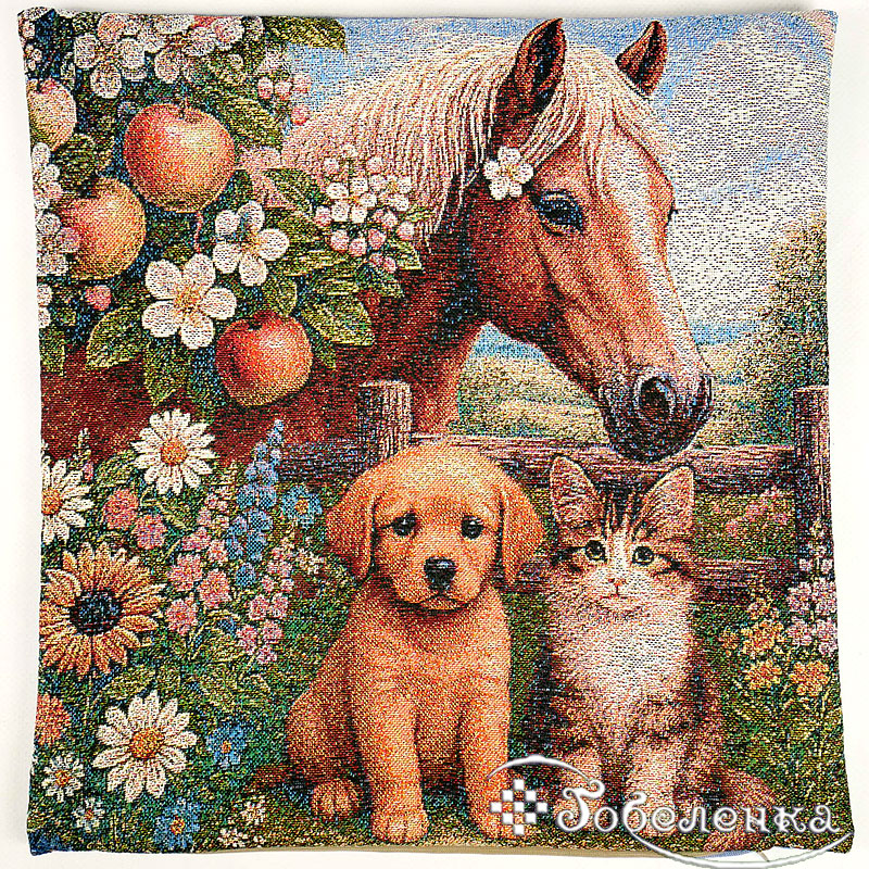 Наволочка декоративная на подушку Лошадь (друзья) - это по-настоящему живая, добросердечная история, воплощённая в гобелене. На первый взгляд - лишь текстиль, но в каждом штрихе этого тёплого рисунка спрятаны эмоции: доверие преданной лошади, беззаветная дружба щенка и любознательный взгляд котёнка. Их объединяет спокойствие, солнечный летний день и ощущение, что дом - именно там, где тебя любят и ждут.