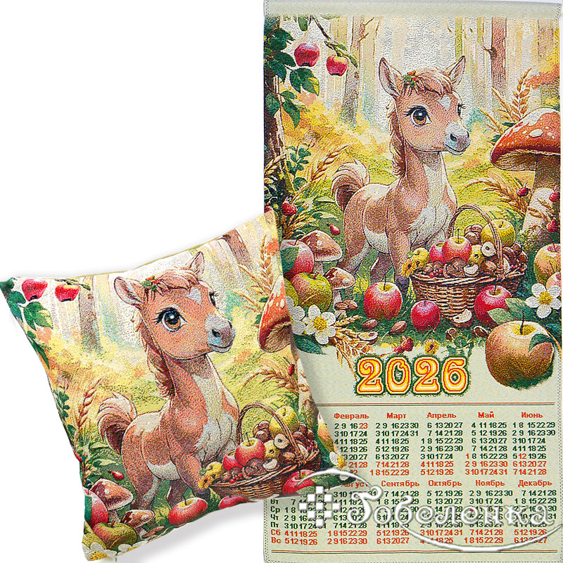 Календарь украшен ярким и выразительным изображением лошади , окруженной символами изобилия – спелыми плодами и дарами природы. Цветовая гамма включает теплые тона : золотистый , янтарный , оранжевый и коричневый , которые ассоциируются с богатством , энергией и жизненной силой . Фон выполнен в мягких пастельных оттенках, что добавляет композиции легкость и уют. Каждая деталь гобелена говорит о процветании и успехе , которые ожидают вас в 2026 году .