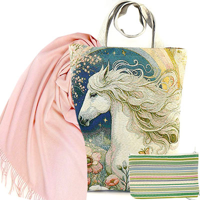 Сумка из гобелена с белым конем симфолом года + подобранные в тон палантин и косметичка - нежный новогодний подарок