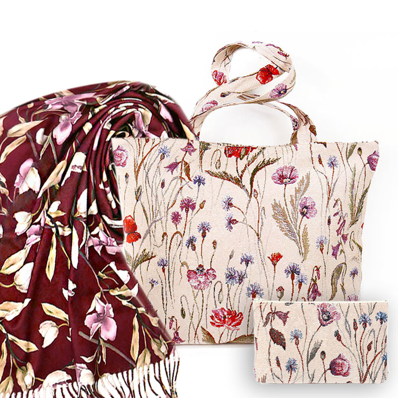 Набор подарочный: Сумка с подкладкой и молнией (широкая) Полевые цветы 31х42 см, гобелен + Косметичка +Палантин тёплый Зимняя Орхидея №11 (бордо) 70х180 см (100% кашемир)