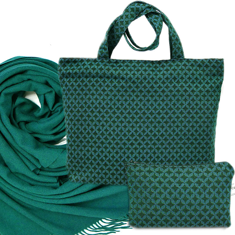 Сумка и косметичка выполнены из гобелена с аккуратным геометрическим орнаментом в изумрудно-синей гамме, создающим ощущение фактурного «текстильного ювелирного украшения» и идеально перекликающимся с мягким однотонным палантином.