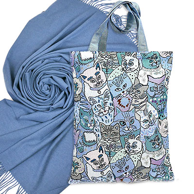 Этот набор говорит о заботе без слов: тёплый палантин согревает в дороге и на прогулке, а смешные коты на сумке поднимают настроение даже в самый серый день.