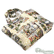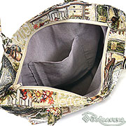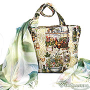 На поверхности сумки - живописная коллажная композиция, словно вырезанная из старинных кулинарных книг и садовых каталогов.
