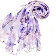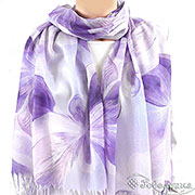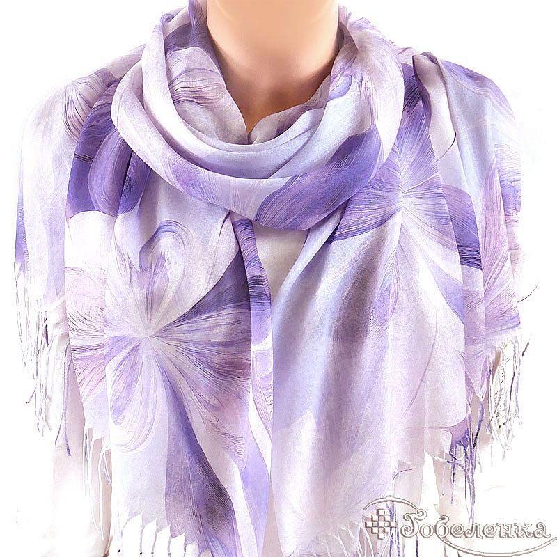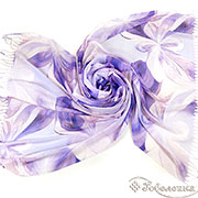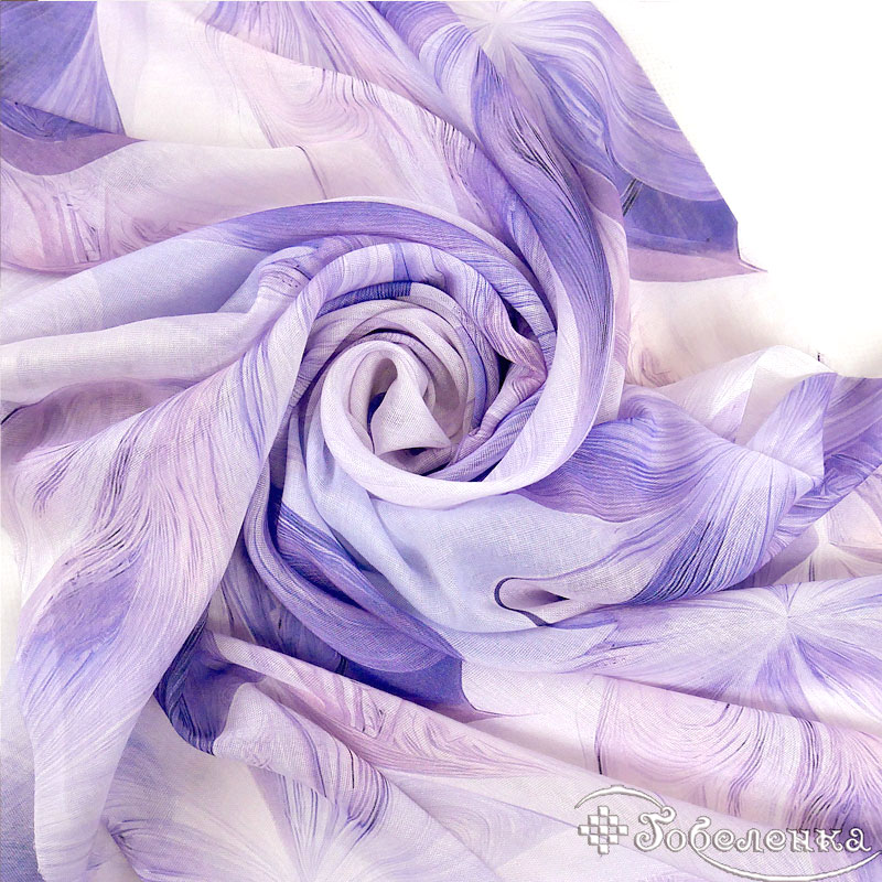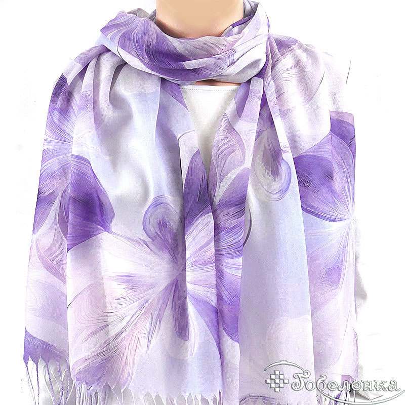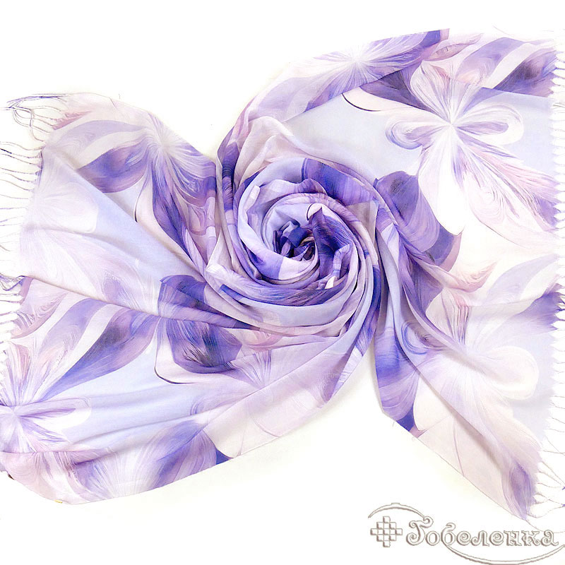 Легкий летний палантин Весна сиреневого цвета натруального состава - украшает гибкий, плавный рисунок из крсивых цветов. Этот узор выполнен в единой нежно-сиреневой гамме с мягкими переходами тона, что создаёт эффект движения, глубины и благородной сдержанности.