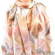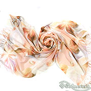 Палантин украшен нежным цветочным узором, который напоминает весенний сад в полном расцвете. Цветы выполнены в мягких пастельных тонах, создавая ощущение легкости и свежести. Каждый цветок словно оживает на ткани, добавляя изделию изысканности и утонченности.