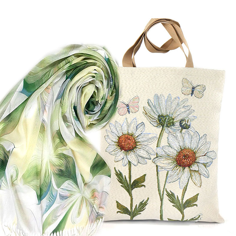 Гобеленовая сумка украшена нежными ромашками, символизирующими чистоту, легкость и природную гармонию. Мягкие пастельные тона создают атмосферу беззаботного летнего дня. Палантин Весна в салатовых оттенках добавляет образу свежести и спокойствия.