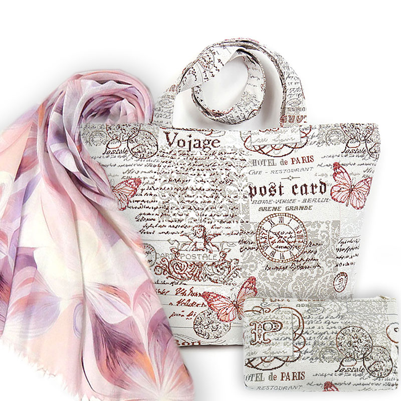 Это очаровательное трио включает в себя гобеленовую сумку, украшенную интересным дизайном, как будто с открыток, в тон ей косметику на молнии и крсивый летний большой шарф с цветами.