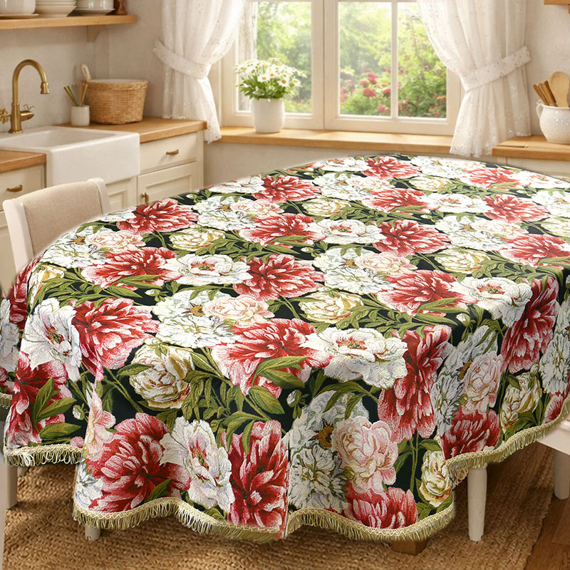 Скатерть овальная Роскошные пионы на стол — созданна для тех, кто ценит красоту и гармонию. Она словно переносит вас в цветущий сад, где каждый лепесток излучает тепло и уют. Гобеленовая ткань придаёт изображению глубину и объём, делая его живым и насыщенным.