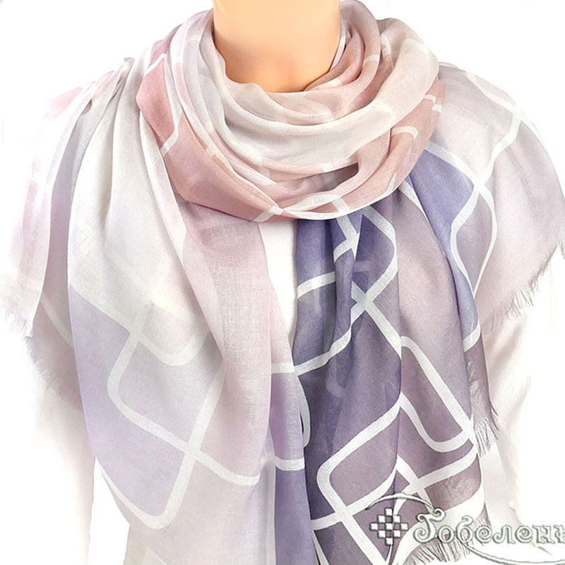 Летний большой женский шарф Лабиринт удачи с геометрическим рисунком в цвете сиреневые сумерки смягчает образ, делает лицо свежее и добавляет “тихую роскошь” благодаря нежной пастели и графичному лабиринту.