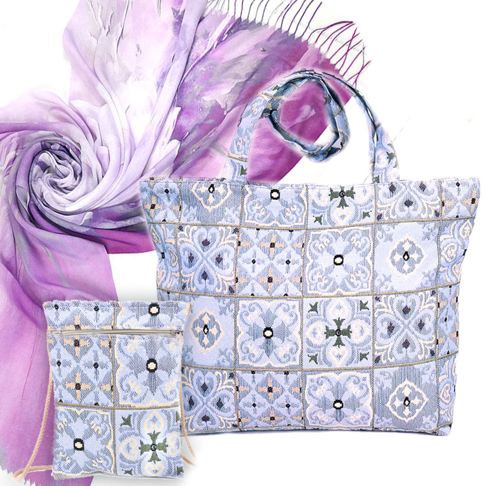 Гобеленовая сумка Чародейка (31х42 см) – сделан в прохладных лавандово-сиреневых тонах и светлая «фарфоровая» база, из-за чего он смотрится чисто, свежо и очень подарочно. На сумке — спокойный узор в стиле плиточного орнамента, который выглядит аккуратно и «дорого» за счёт ритма и симметрии.Внутри сумки подкладка, есть внутренний карман, высота ручек 32 см, сумка закрывается на молнию