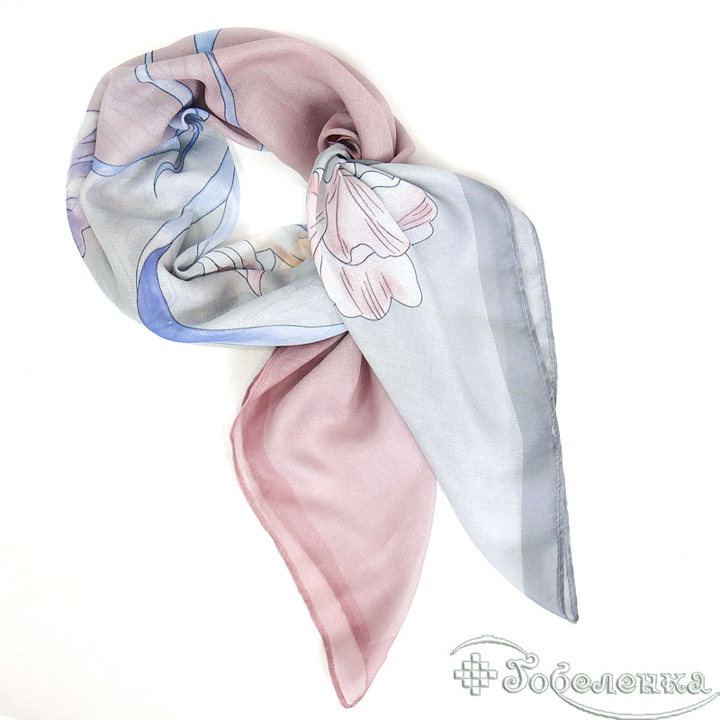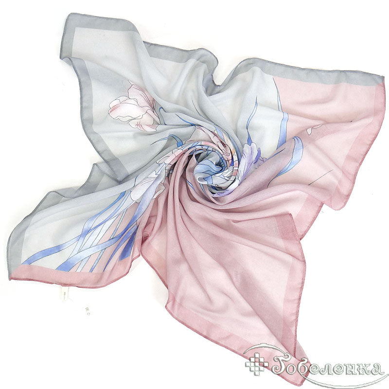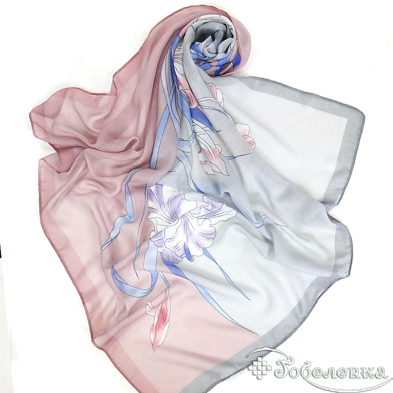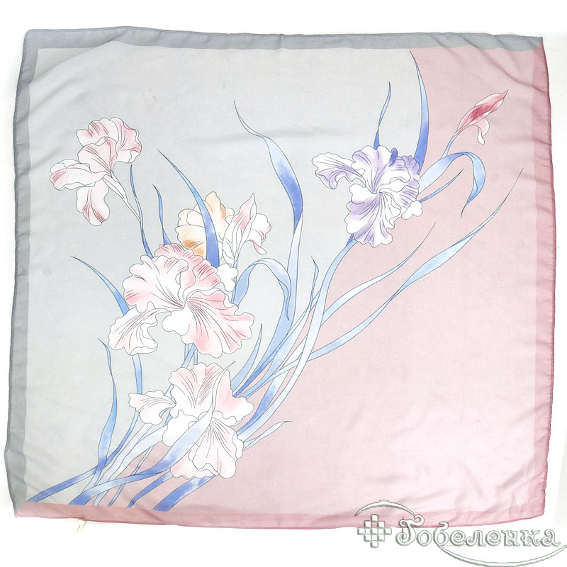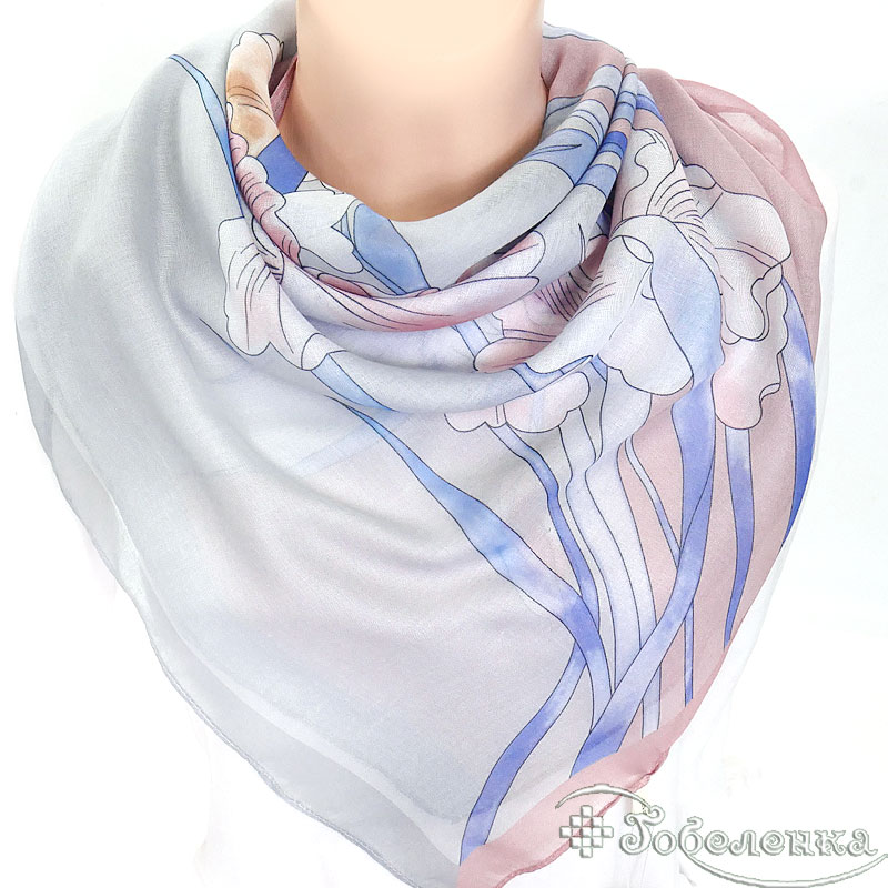 Добавьте платок Ирисы №4 в корзину, если хотите универсальный аксессуар в нежной палитре: он красиво сочетается с белым, серым, денимом, бежевым и пудровыми оттенками. Такой принт также отлично подходит для подарка — выглядит аккуратно и не перегружает образ.