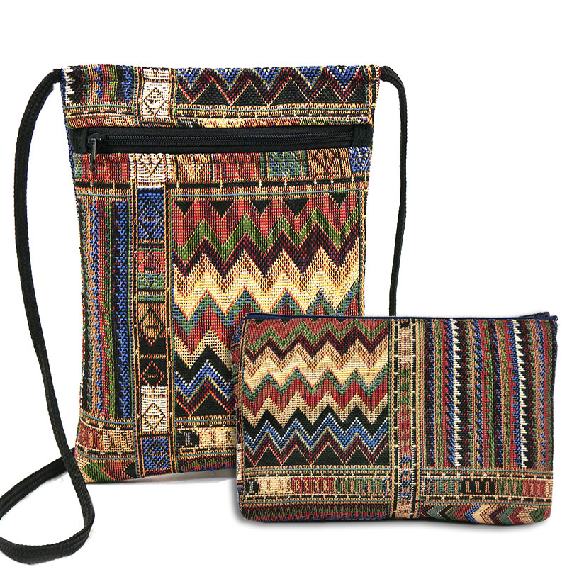 Подарочный набор Мексика - практичный и яркий комплект из гобелена: сумочка для телефона на молнии 15×20 см и косметичка на молнии 14×20 см. Дизайн выполнен в этно‑стиле с геометрическими узорами (зигзаги, полосы, орнаменты) в насыщенных оттенках красного, зелёного, синего, бежевого и чёрного - смотрится эффектно и сразу привлекает внимание.