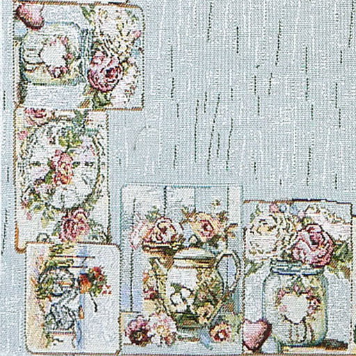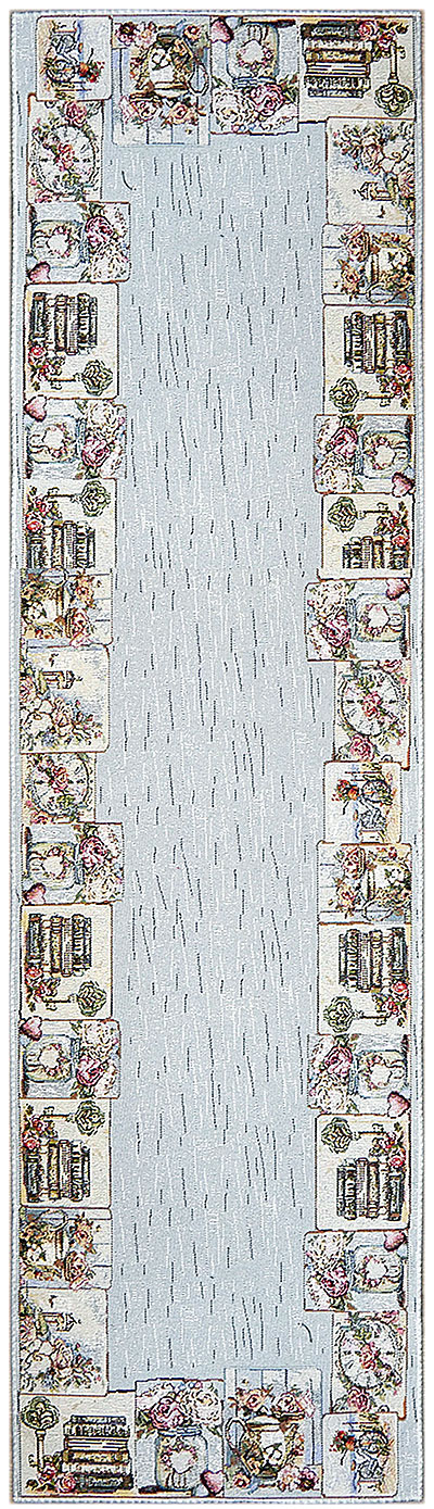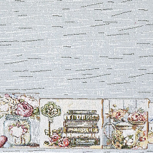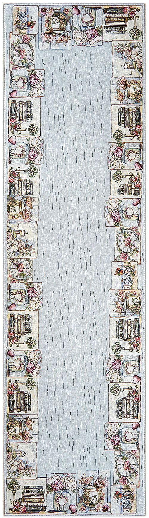 Центральная часть выдержана в спокойной светлой гамме, а по краям идёт декоративный бордюр с романтичными мотивами — такой рисунок делает стол нарядным, но не перегружает интерьер. Дорожку можно стелить на стол как самостоятельный текстильный акцент или поверх однотонной скатерти, чтобы создать многослойную сервировку.