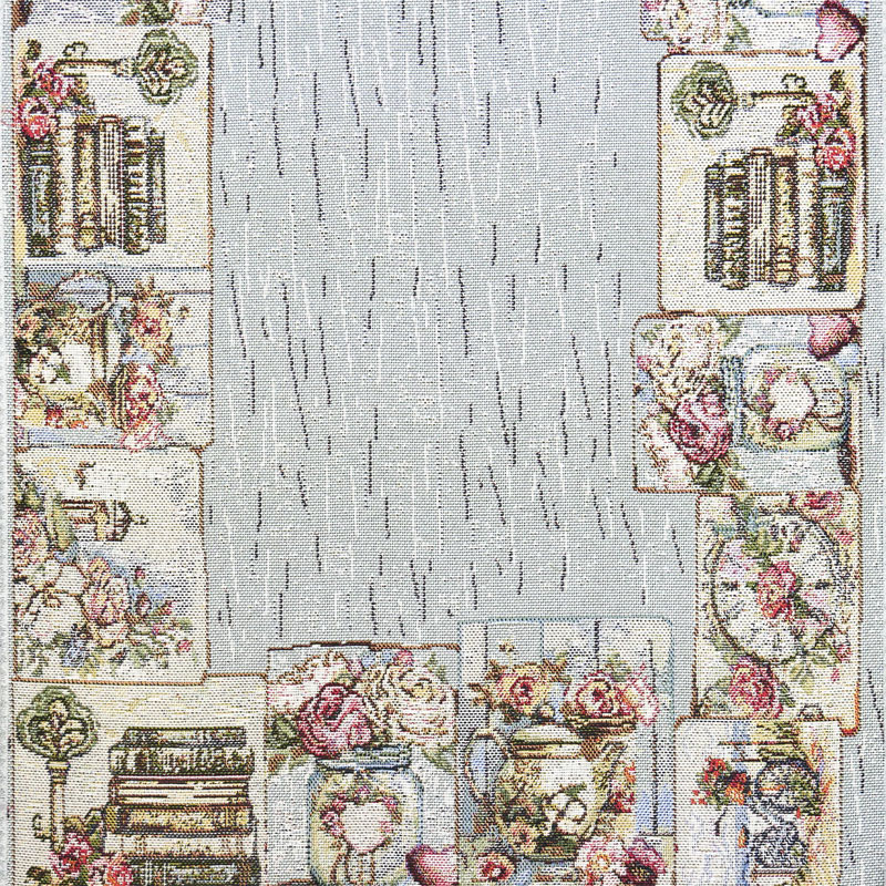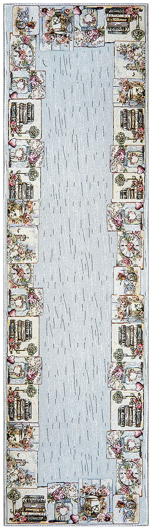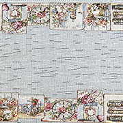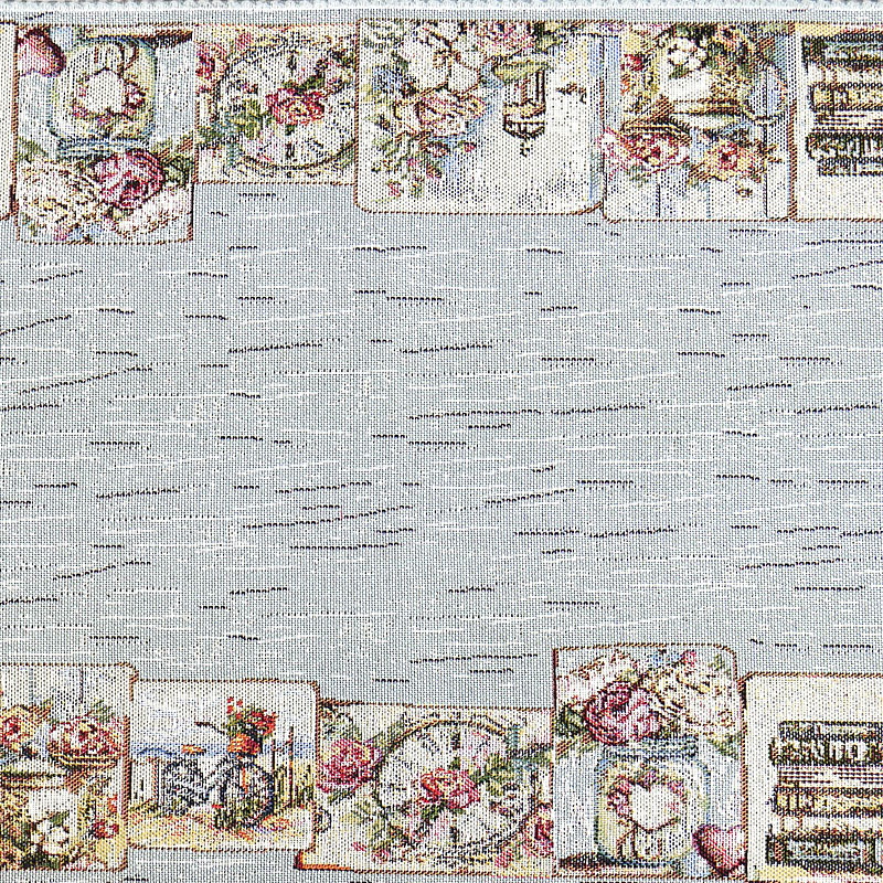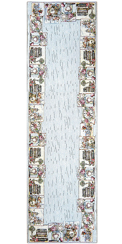 Центральная часть выдержана в спокойной светлой гамме, а по краям идёт декоративный бордюр с романтичными мотивами — такой рисунок делает стол нарядным, но не перегружает интерьер. Дорожку можно стелить на стол как самостоятельный текстильный акцент или поверх однотонной скатерти, чтобы создать многослойную сервировку.