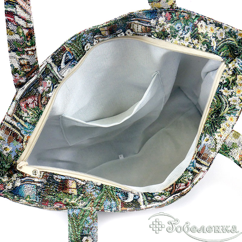 — Подкладка из плотного материала и надежная молния защищают содержимое от потери и повреждений. А внутрений карман создает порядок в сумке. Ручки из гобелена (высота 32 см)- удобны для ношения на плече.