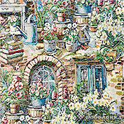 Рисунок, как в старинной открытке: кирпичная стена в терракотовых оттенках с текстурой старого камня - фон для уюта. Цветочные горшки: розовые герани, белые лилии, желтые нарциссы и фиолетовые лаванда, расположенные на полках и подоконниках. Декоративные элементы: синяя поливалка, арка с виноградной лозой, вазы с цветами - каждая деталь создает ощущение «настоящего» сада.