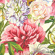 Рисунок. Пионы в оттенках розовой пудры, глубокого малинового и нежно-белого будто только что сорваны с куста. Белые лепестки с перламутровым блеском, розовые - с градиентом от нежного до насыщенного, а фиолетовые акценты добавляют загадочности. Зеленые листья с золотистыми прожилками и тонкие стебли придают узору объем, как в живописи импрессионистов.