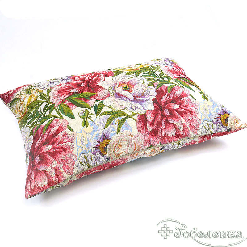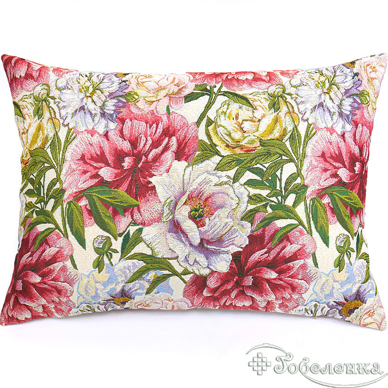 Пионы красные, розовые и белые, их целый букет на чехле. Наволочка на подушку будет украшением вашей гостинной.