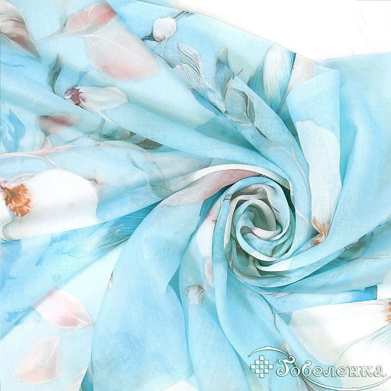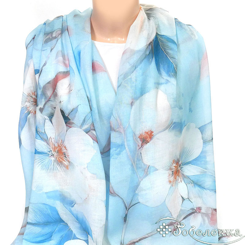 Этот большой женский шарф сине-голубоко оттенка Нежная Магнолия из натурального хлопка станет идеальным выбором для тех, кто ценит красоту и утонченность. Орхидеи, изображенные на нем, символизируют любовь, страсть и изысканность. Они напоминают о том, что красота может быть вечной и всегда рядом с вами.