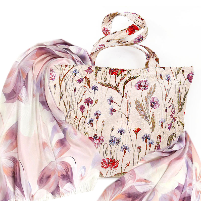 Гобеленовая сумка с длинными ручками на подкладке с цветочным рисунком.
