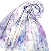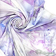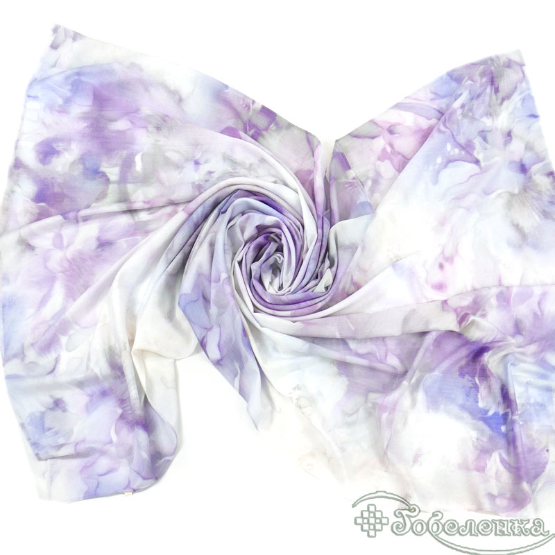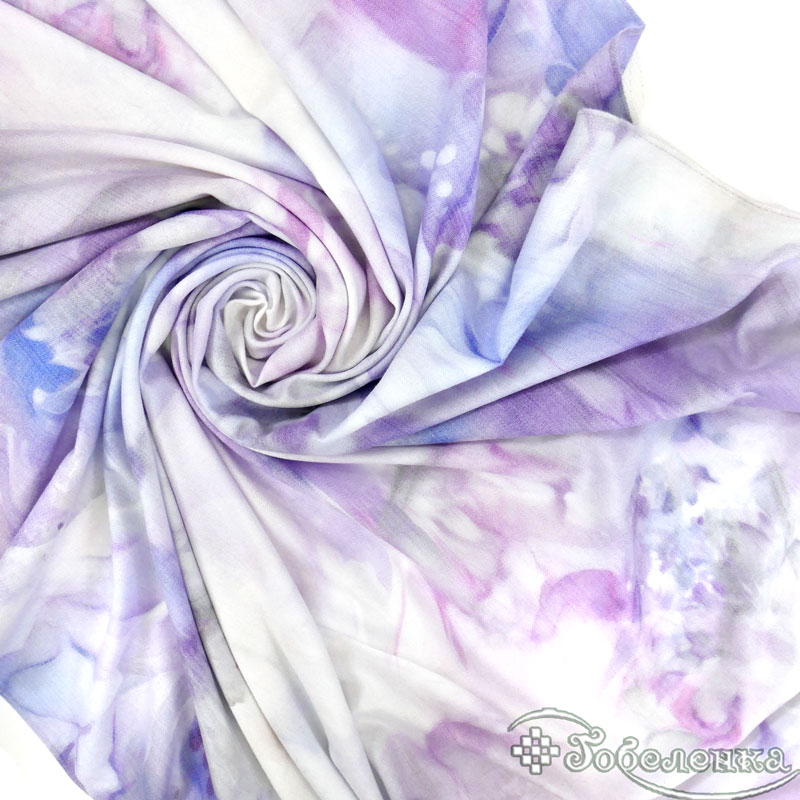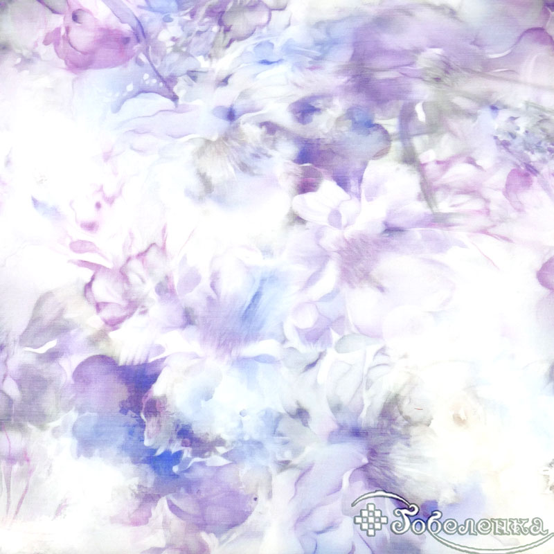 Цветовая гамма: пастельно-фиалковый фон с перламутровым отливом - глубина, напоминающая небо в первые лучи солнца, которая не тускнеет даже под палящим светом. Фиолетовые переходы - от нежного лавандового до кремово-белого, с акцентами персиковых и серо-голубых оттенков. Эффект размытых пятен - как будто цветы нарисованы водой, которая стекает по ткани. Микро-детали: мелкие точки и линии, напоминающие капли росы