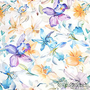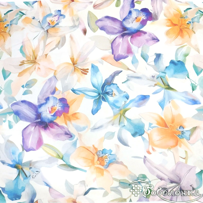 Цвет и рисунок . Разноцветье в деталях: синие орхидеи как капли дождя на лепестках, которые мерцают под лучами солнца. Фиолетовые акценты , оранжевые и персиковые цветы - яркие вспышки энергии , а зеленые листья с золотистыми прожилками - тонкие линии, которые связывают композицию, создавая ощущение объема.
