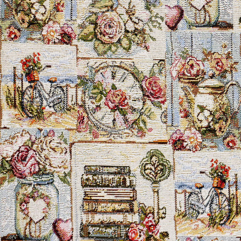 Cкатерть Французский роман - это гобеленовое полотно со сценкой в духе старой Европы: цветы, книги, часы и детали городской прогулки создают ощущение истории на столе.