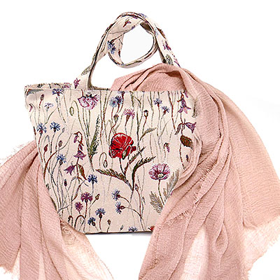 Гобеленовая сумка с длинными ручками на подкладке с цветочным рисунком.