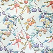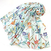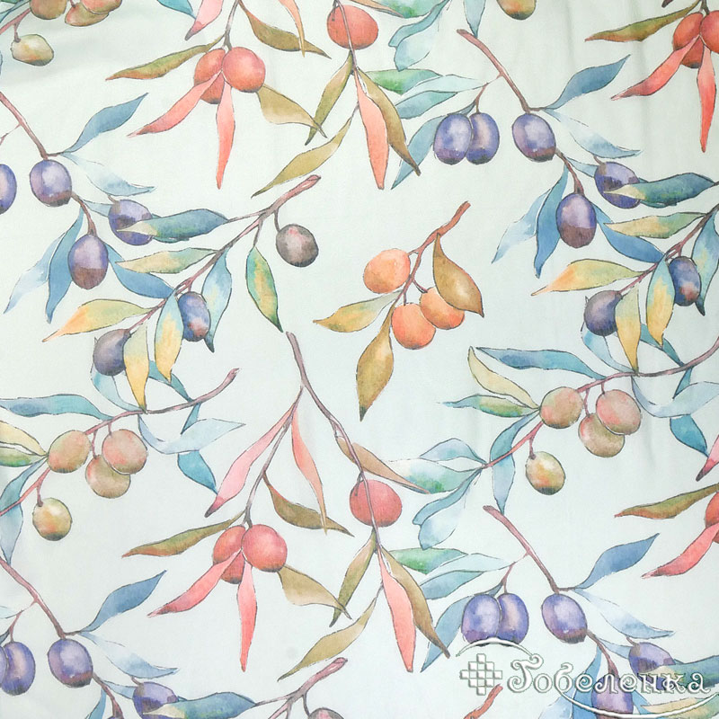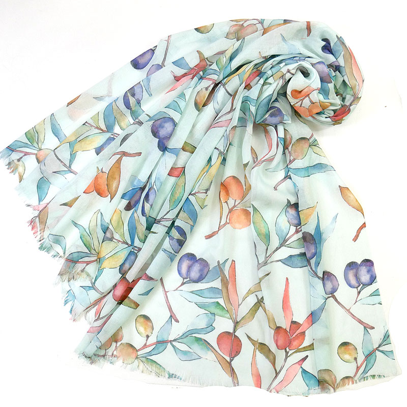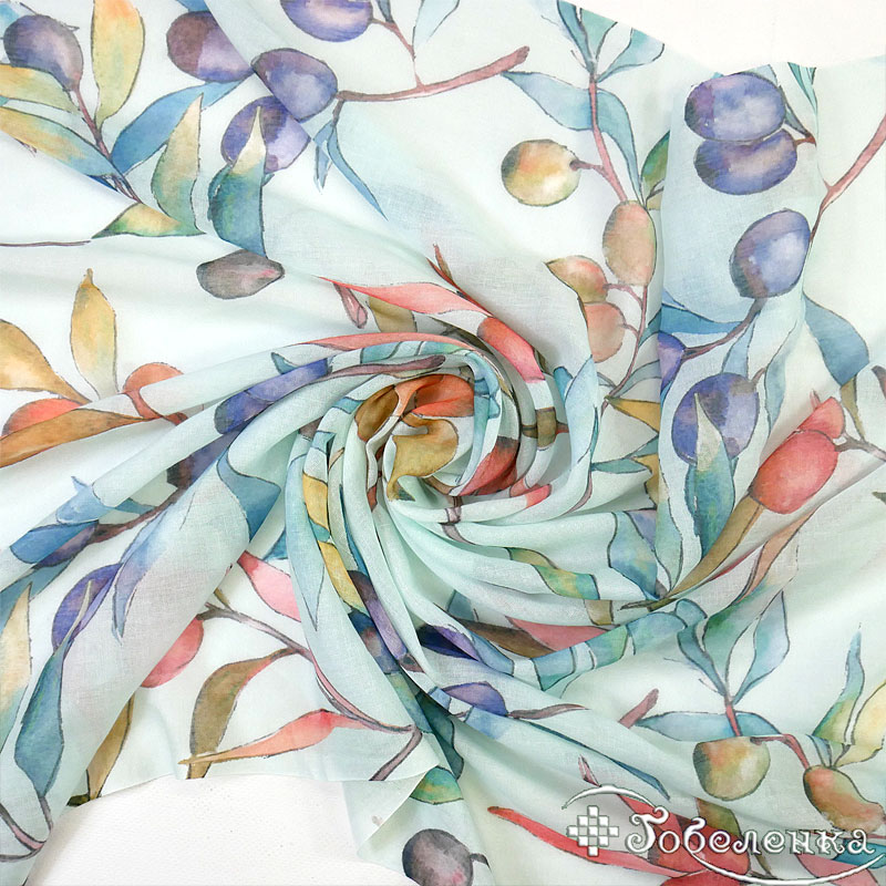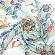 Основой палантина стал нежный мятно-голубой фон, на котором раскинулись ветви с плодами и листьями, исполненные в технике акварельной живописи. Принт включает кораллово-розовые, персиково-оранжевые, насыщенно-синие, фиолетовые и оливково-зелёные элементы. Художественная размытость контуров и свободная композиция создают эффект ручной росписи, а контраст ярких плодов на мятном фоне добавляет динамики и летней энергии.