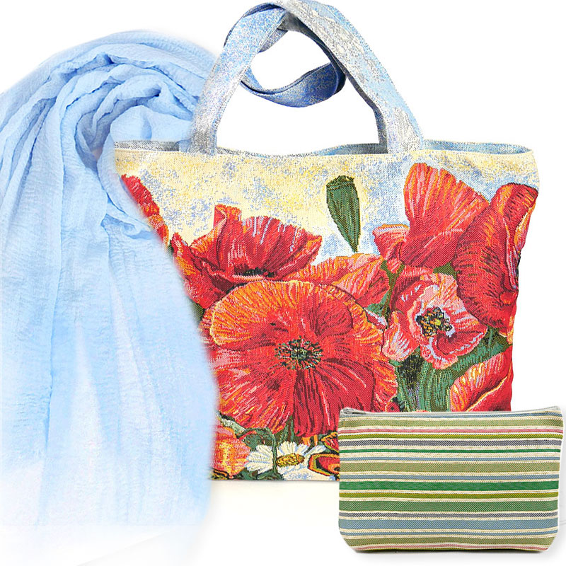 Подарочный набор с маками и голубым палантином - интересное решение для тех, кто ценит яркость и практичность. Гобеленовая сумка с молнией и подкладкой, натуральный хлопковый палантин и компактная косметичка создают функциональный летний комплект, поэтому набор хорошо работает как готовый подарок, добавляя образу свежести, настроения и продуманности.