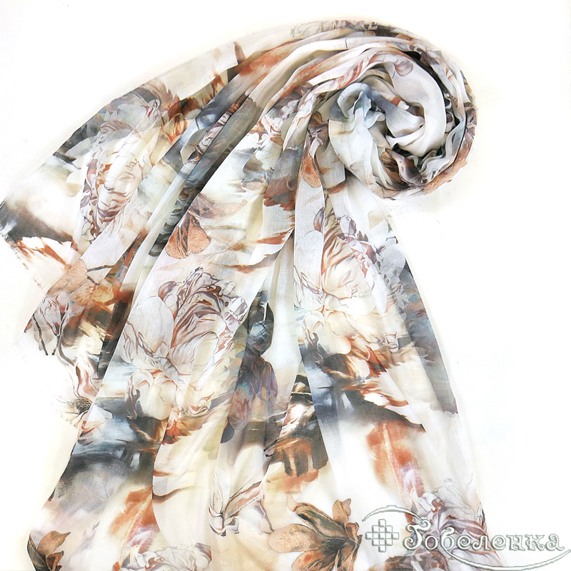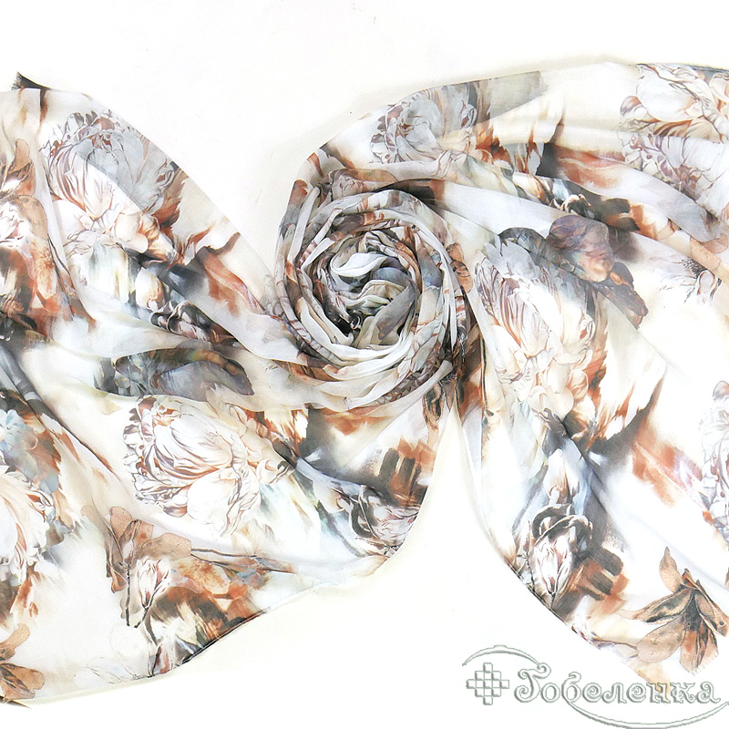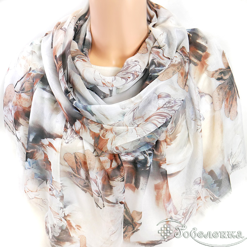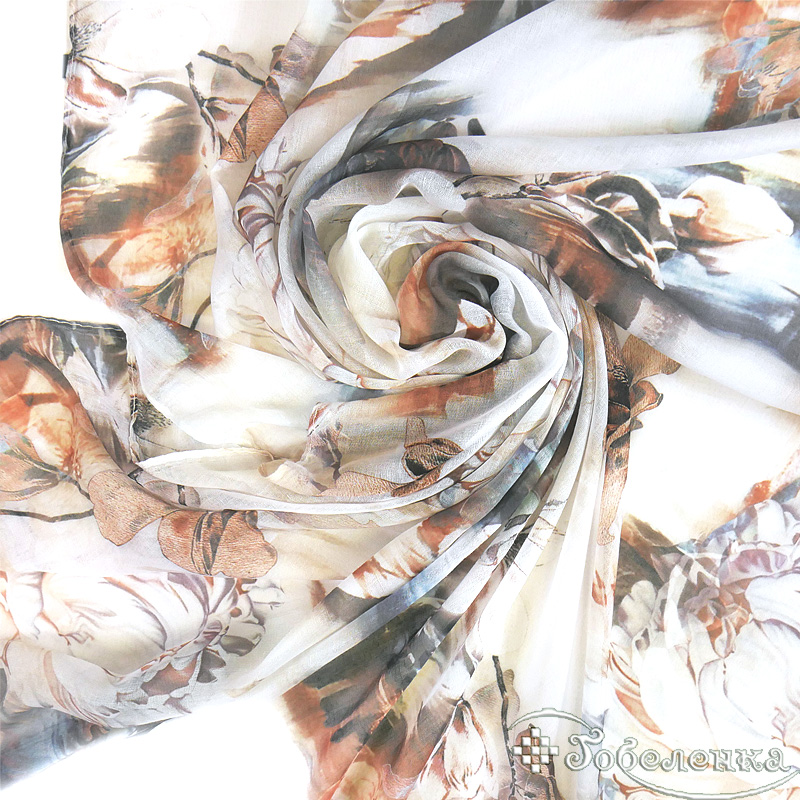 Палантин Пионы 170х70 см (модал 100%) -это изысканный палантин с крупными пионами в тёплых бежево-коралловых оттенках. Цветочный принт в акварельной технике создаёт эффект художественной росписи, где нежные лепестки словно парят на светлом фоне с переливами серого и золотистого. Этот аксессуар дарит ощущение роскоши и изысканного вкуса - идеальный выбор для тех, кто ценит искусство в деталях.