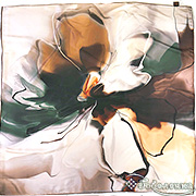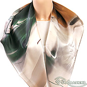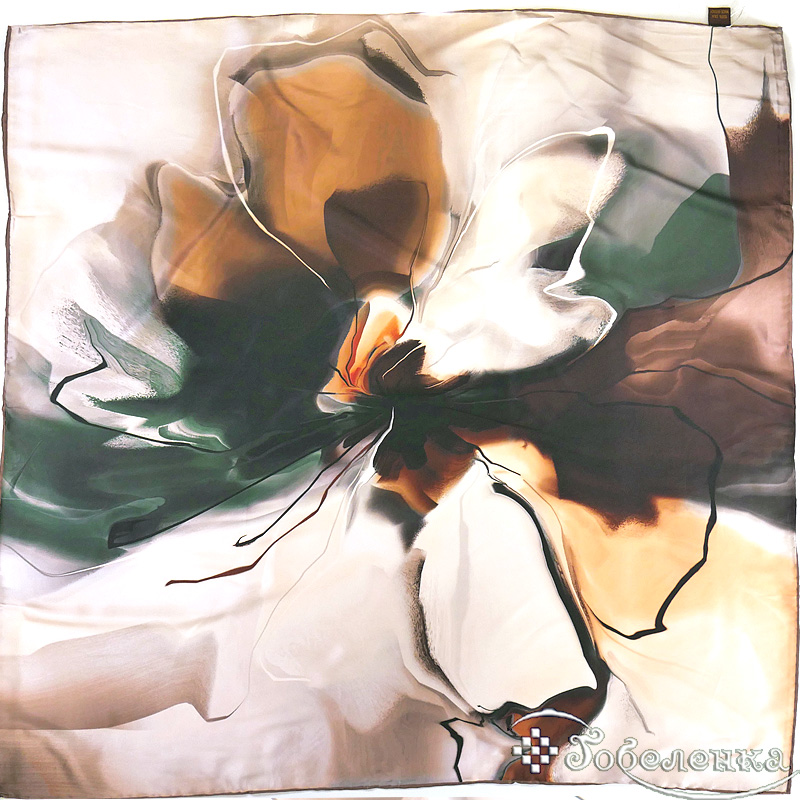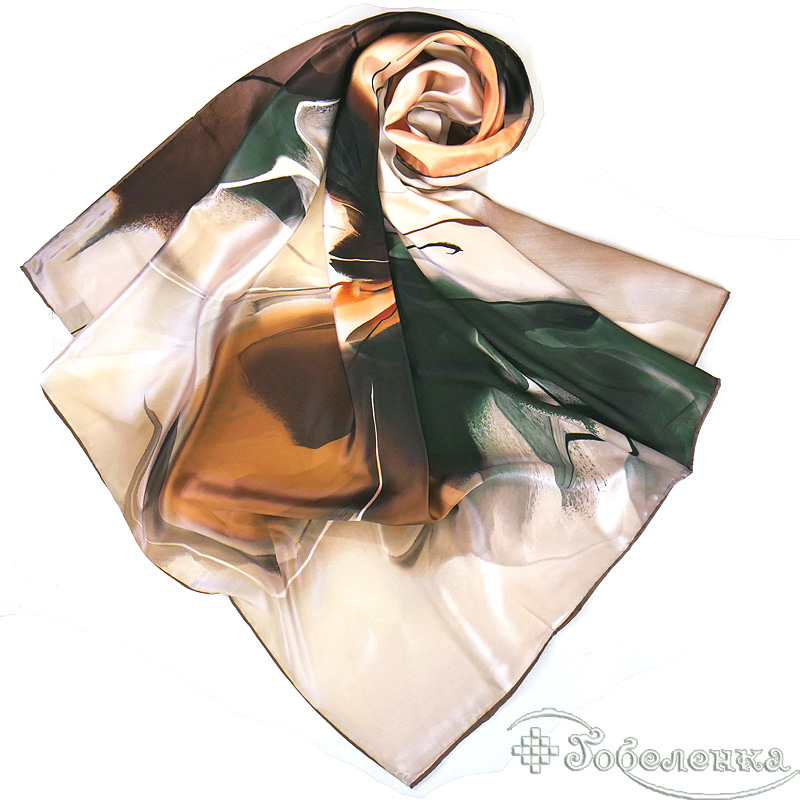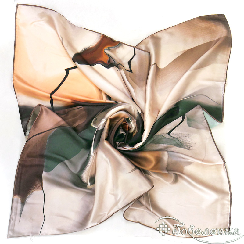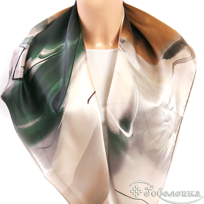 Шикарный шёлковый платок с абстрактным цветочным принтом - это произведение искусства, где изумрудно-зелёные всплески танцуют в вальсе с золотисто-бежевыми и белыми оттенками, создавая ощущение роскоши и утончённой элегантности. Чёрные графичные линии подчёркивают динамику композиции, придавая платку современный художественный характер и неповторимый шарм. Этот аксессуар воплощение изысканного вкуса и смелой женственности, способный превратить любой образ в запоминающийся шедевр.