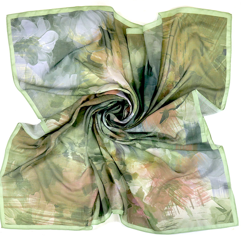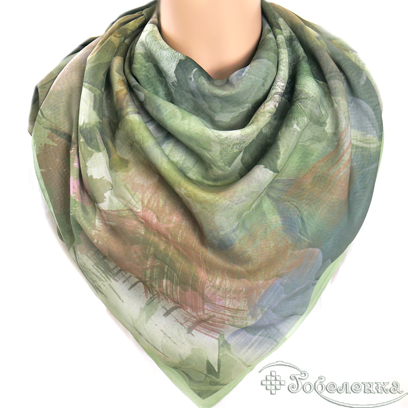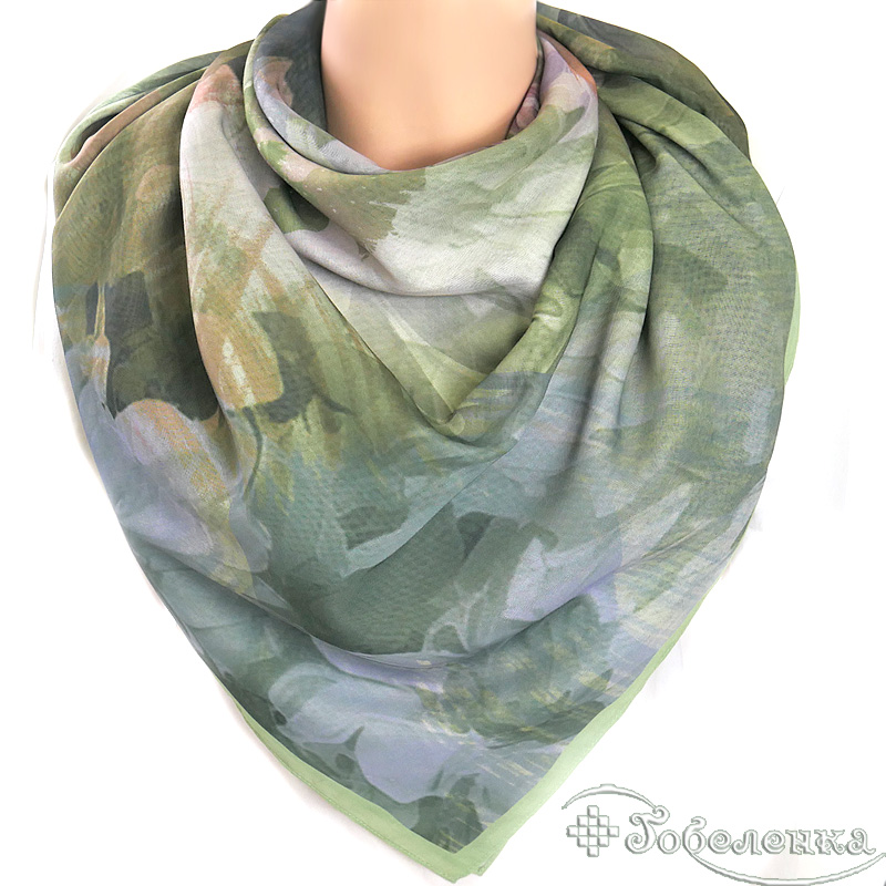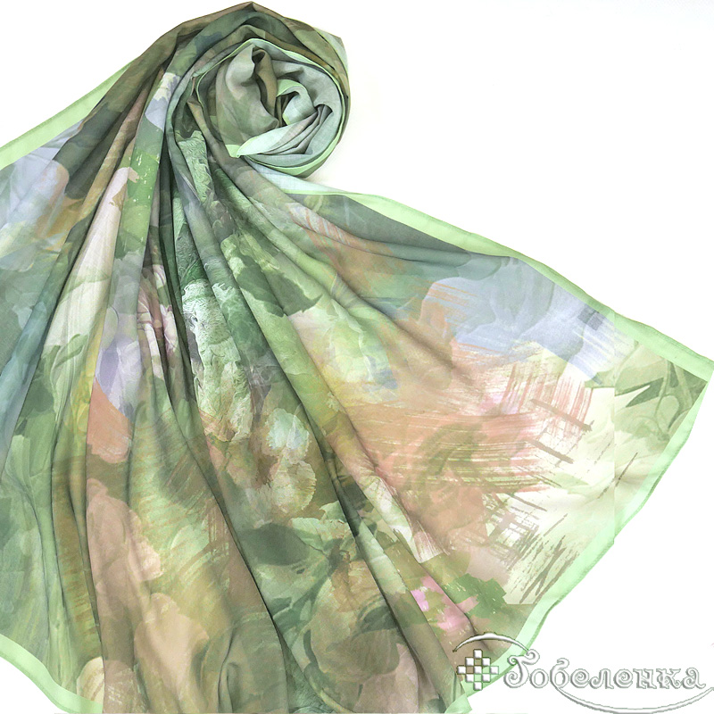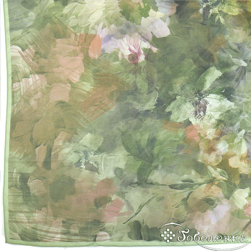 Этот роскошный большой легкий платок погружает в атмосферу старинного сада, где размытые цветочные силуэты в зелёных, персиковых и лавандовых тонах создают эффект акварельной живописи. Приглушённая палитра античной зелени с мягкими переходами цвета дарит ощущение спокойствия и утончённой элегантности, словно сошедшее с полотна импрессиониста. Крупный формат позволяет носить платок множеством способов, делая его универсальным аксессуаром для ценителей искусства в одежде.