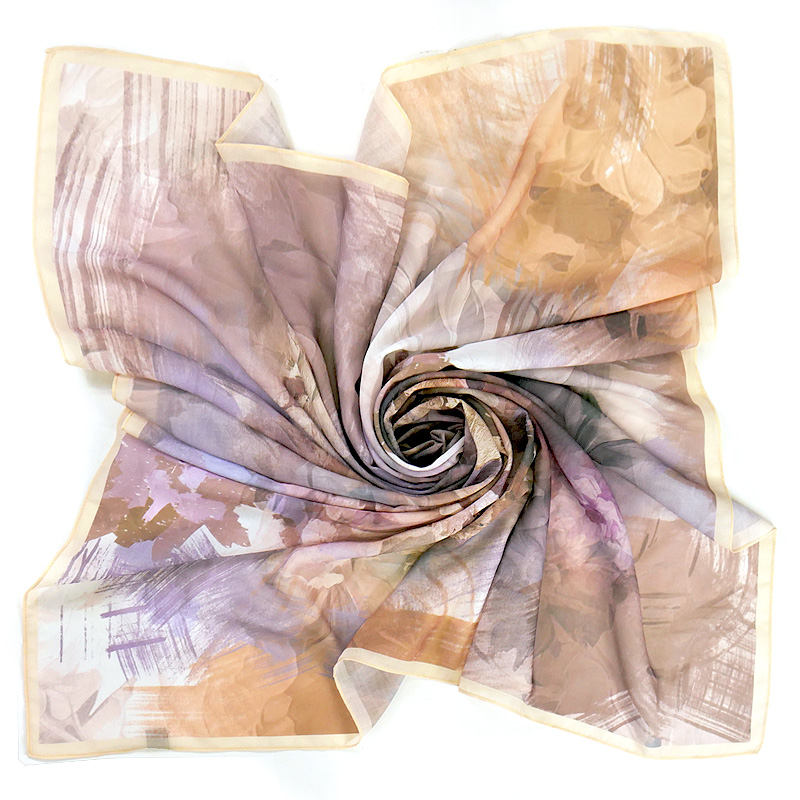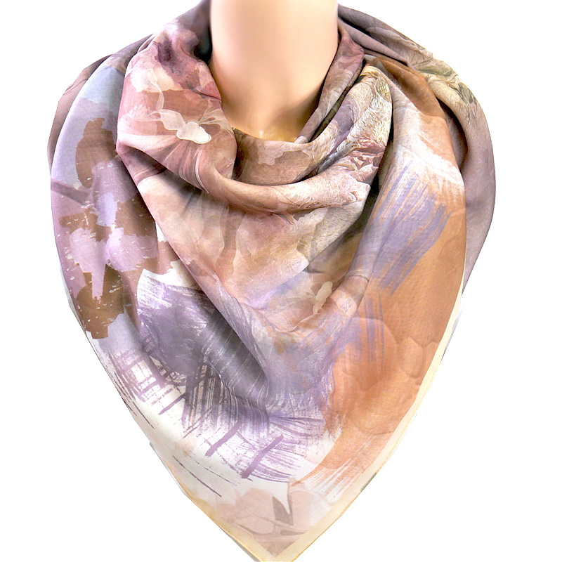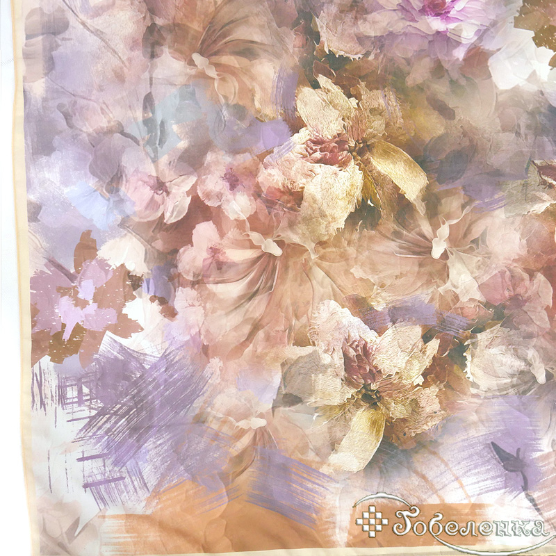 Платок Цветочная опера. Сиреневый шёпот 117х117 см (62%вискоза, 38% модал) -романтичный платок с изысканным цветочным принтом в нежных сиренево-пудровых тонах. Акварельная роспись создаёт эффект воздушности и лёгкости, а приглушённый оттенок «Сиреневый шёпот» придаёт изделию особую поэтичность и винтажное очарование.
