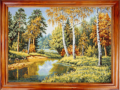Гобелен картина В краю березового ситца в деревянной раме -это дыхание природы, тишина, спокойствие и красота. Белые берёзы с тонкими стволами, будто нарисованные акварелью, стоят у тихой речки, которая отражает золото осени. Листья — оранжевые, жёлтые, красные - как будто только что упали с деревьев. Трава - зелёная, с желтыми оттенками, будто ещё не успела сменить цвет.