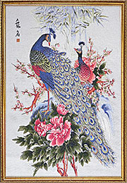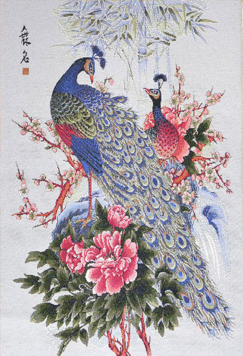 Мы представляем вам изящную картину в гобелене Павлины, выполненную в традиционном восточном стиле. В центре композиции расположены два павлина, которые привлекают внимание своей яркой и насыщенной окраской. Их перья переливаются всеми оттенками синего, зеленого и золотого, создавая впечатление роскоши и величия.