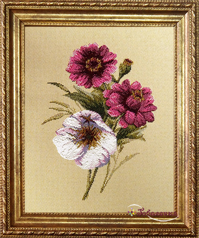 Багет золотисто-матового цвета идеально гармонирует с сюжетом картины, подчеркивая ее природность и естественность, и благодаря ему цветы как бы светятся изнутри. Прекрасный подарок на любой праздник или юбилей, тем более что у картины есть пара - "Бутоньерка Анна". Вместе они составят великолепный и трогательный ансамбль, который украсит интерьер любого помещения и создаст настроение радости